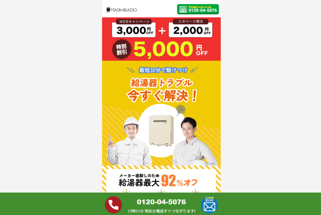 「急にお湯が出なくなった」「エコキュートから異音がする」などのトラブルを、電話申し込みから最短30分で解決してもらえます。